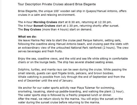 Set sail on Brisa Elegante, a stunning 100-foot wooden sail ship offering unforgettable luxury cruises from Marina Pez Vela in Quepos/Manuel Antonio. Choose from morning, sunset, or custom day cruises, each designed to deliver a calm, relaxing, and elegant experience on the Pacific Ocean.