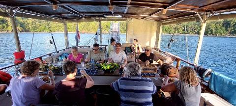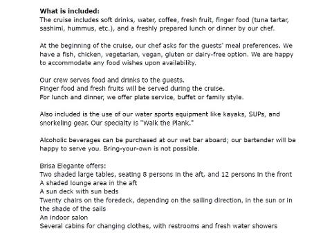 sashimi, hummus, etc.), and a freshly prepared lunch or dinner by our chef. At the beginning of the cruise, our chef asks for the guests' meal preferences. We