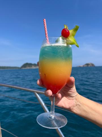 As you glide past Parque Nahomi, Manuel Antonio Beach, and the untouched National Park coastline, enjoy complimentary beverages and fresh tropical fruits served by the friendly crew. Watch for dolphins, sea turtles, manta rays, and colorful seabirds along the way — and during whale season (July–September & December–January), witness these gentle giants in their natural habitat.